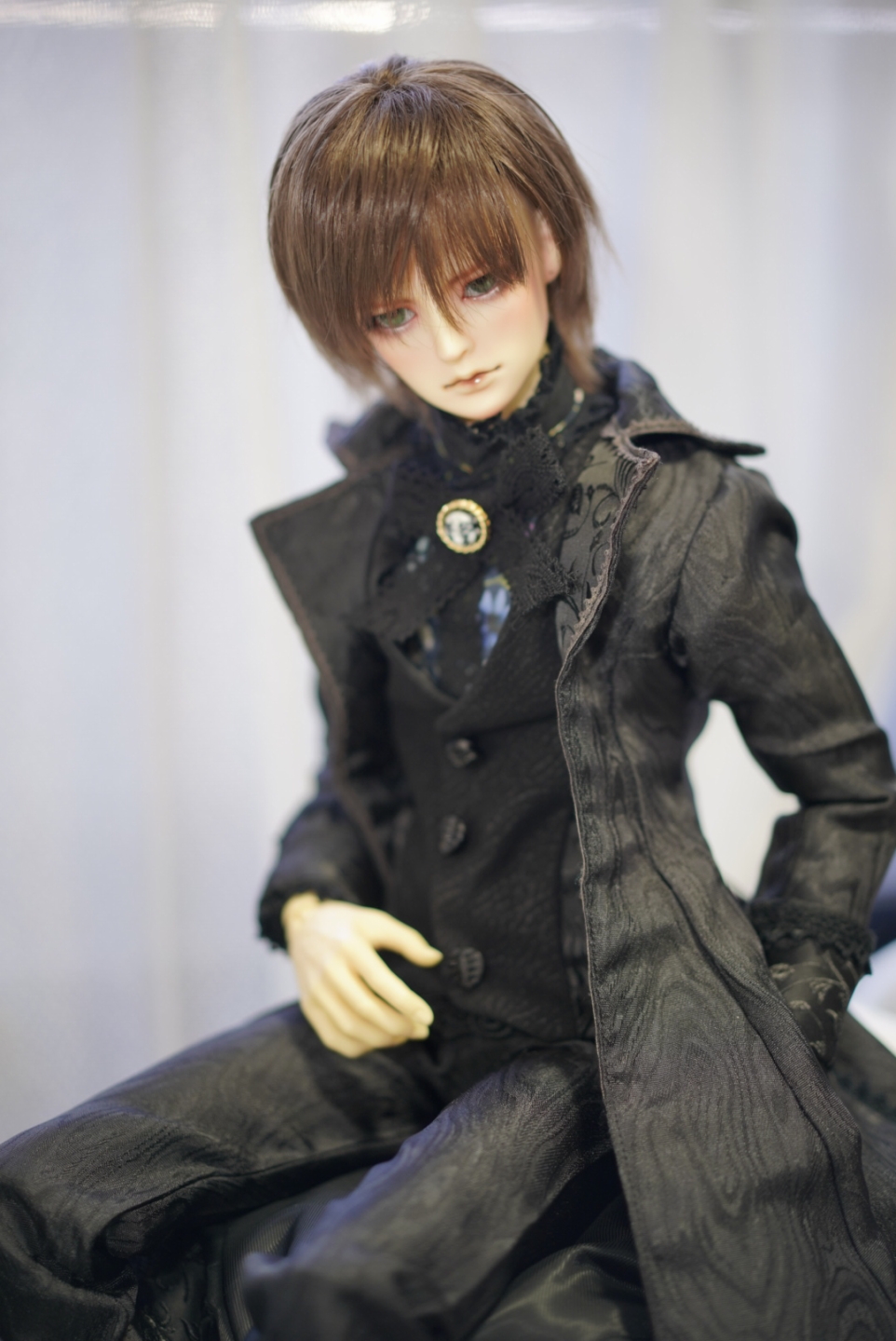 マントは写真左側のみスナップピンで留めることができますが、マントを外して撮影することを前提にして製作しておりますので、ブローチの針でベストまで通してもらうと安定するかと思います。