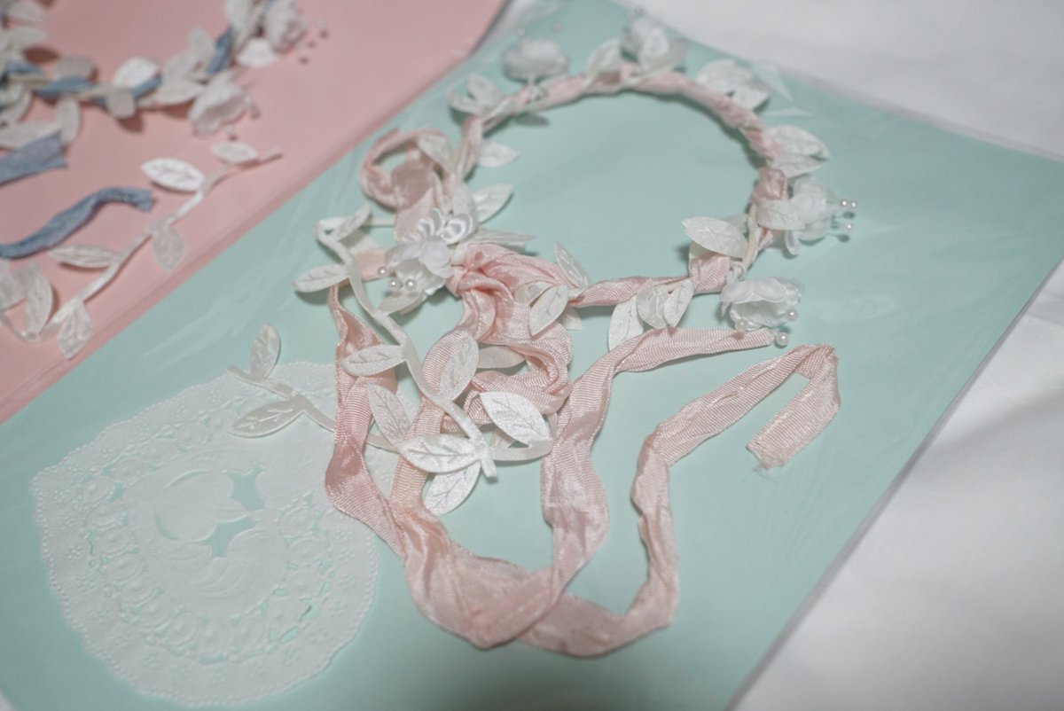 当方の白いドレス、「すずらん」と「ゆきやなぎ」をお買い上げ下さった方で、花輪をご希望の方へお譲りいたします。お色はピンクとブルー1種類ずつとなります。